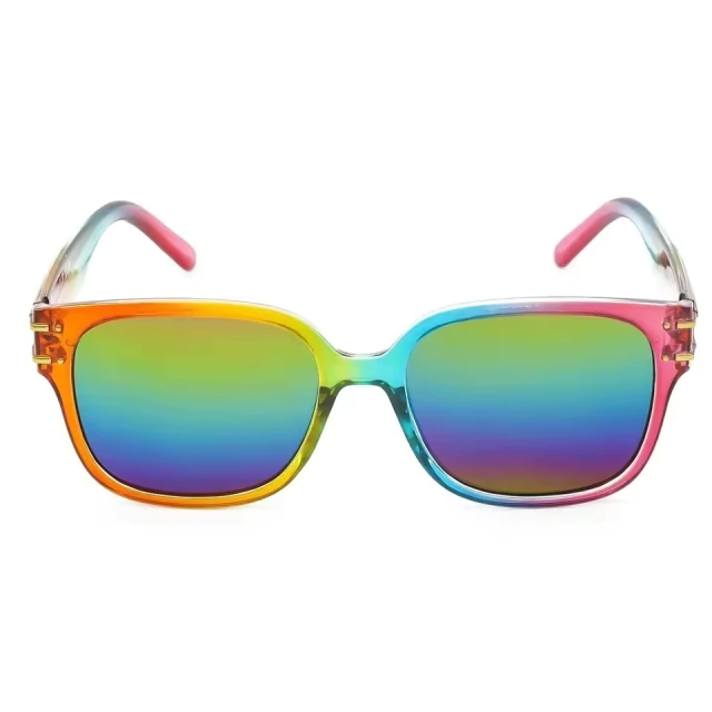Óculos de Sol com lente espelhada e armação nas cores do arco-íris.